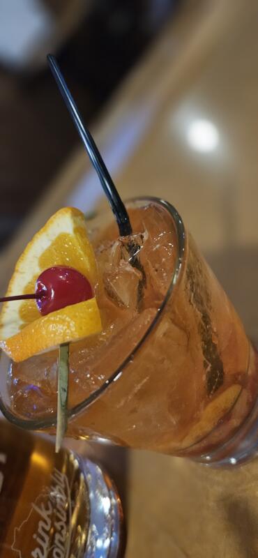 Rotational Bourbon, Orange Slice, Cherry, Simple Syrup, Angostura Bitters, Sour Soda